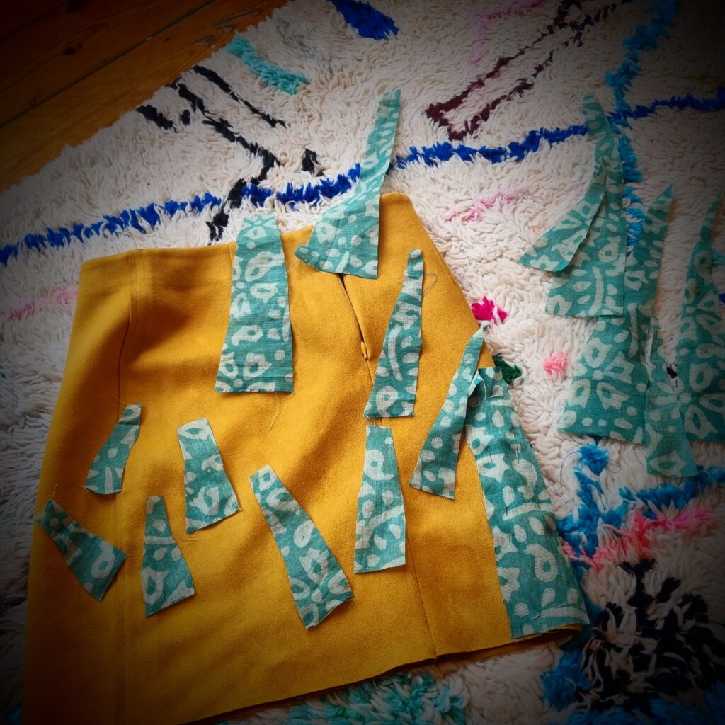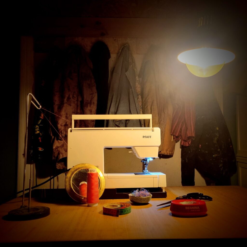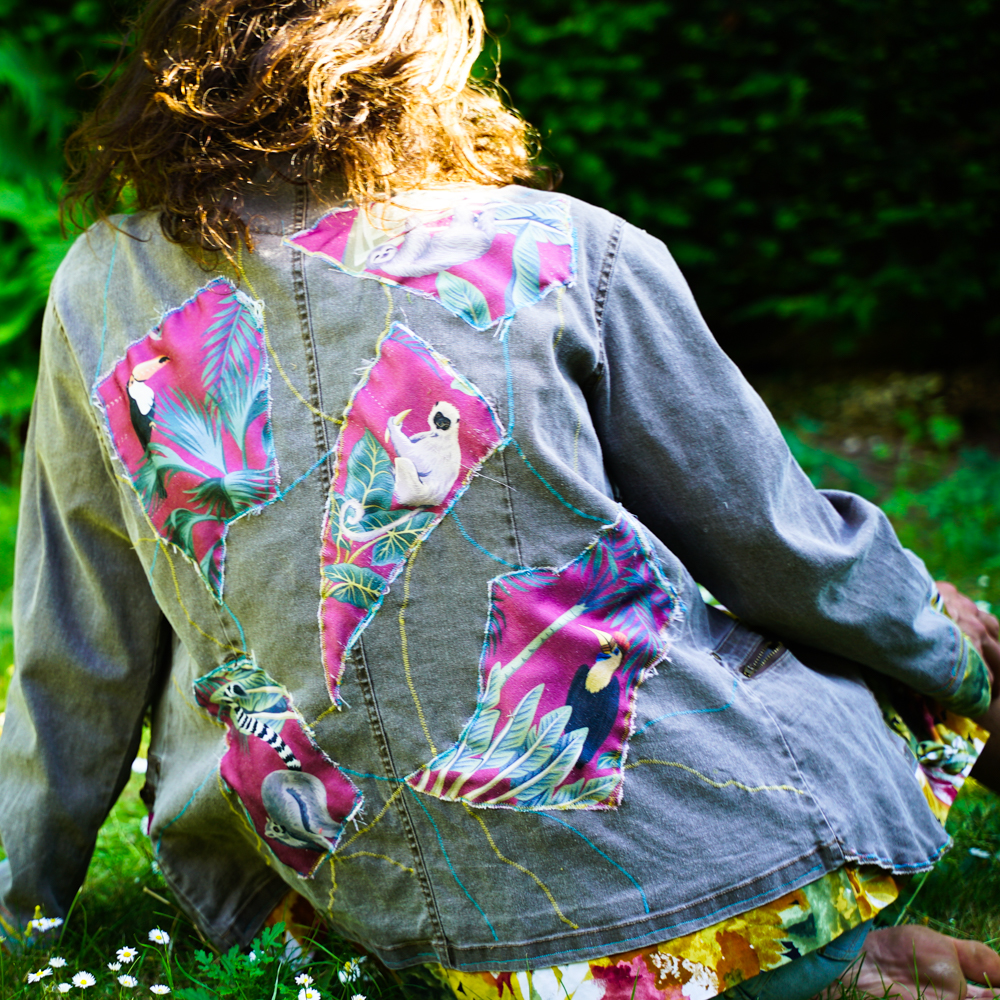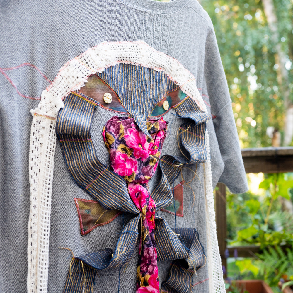 J’utilise des tissus chinés de toutes sortes, ci et là, j’assemble à la machine les textures, les fils, les reliefs et leurs histoires.