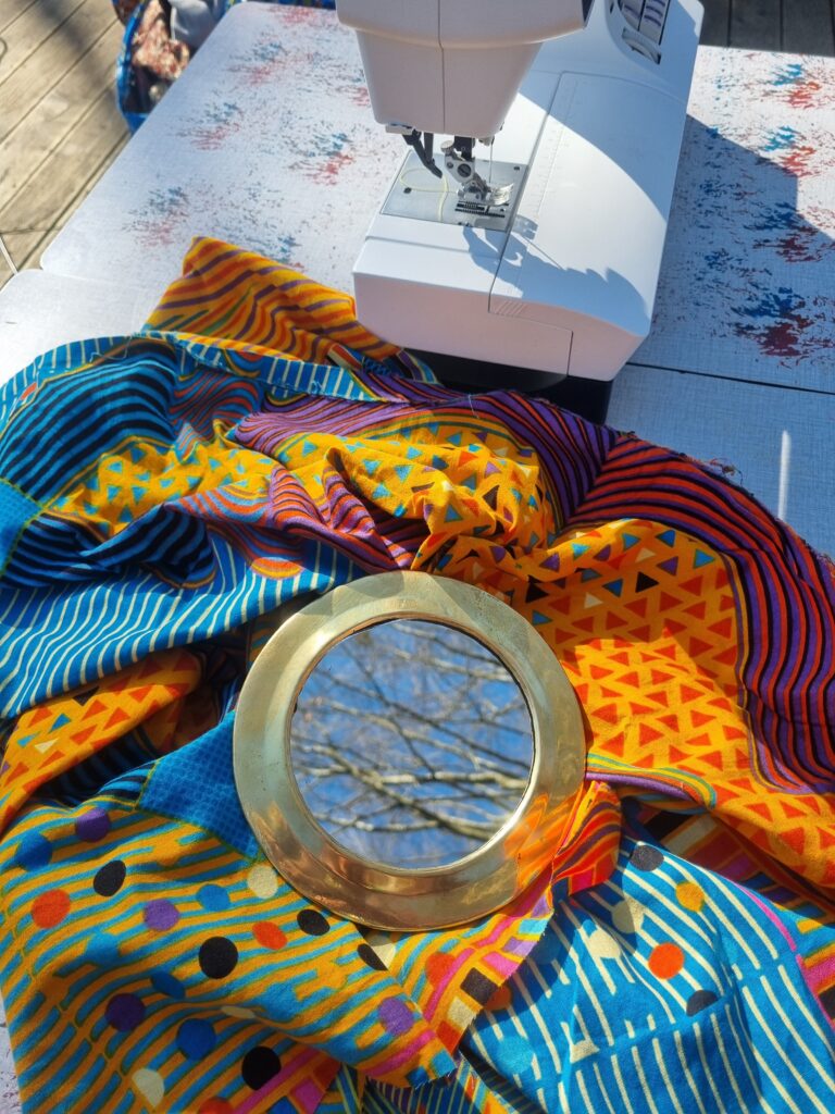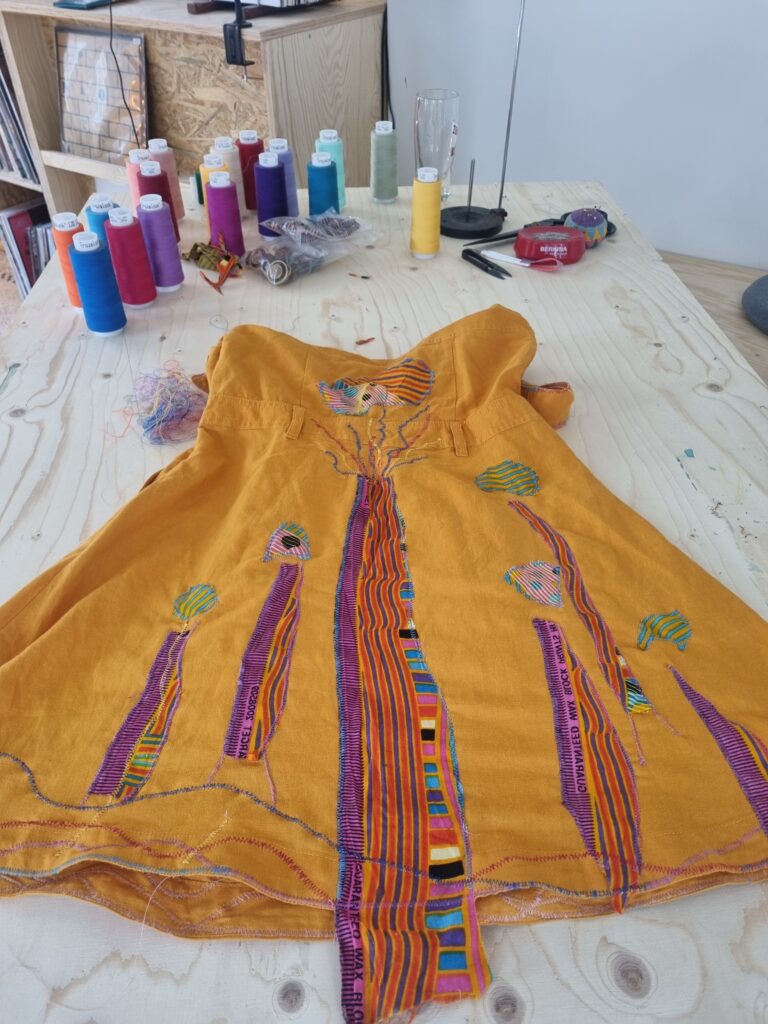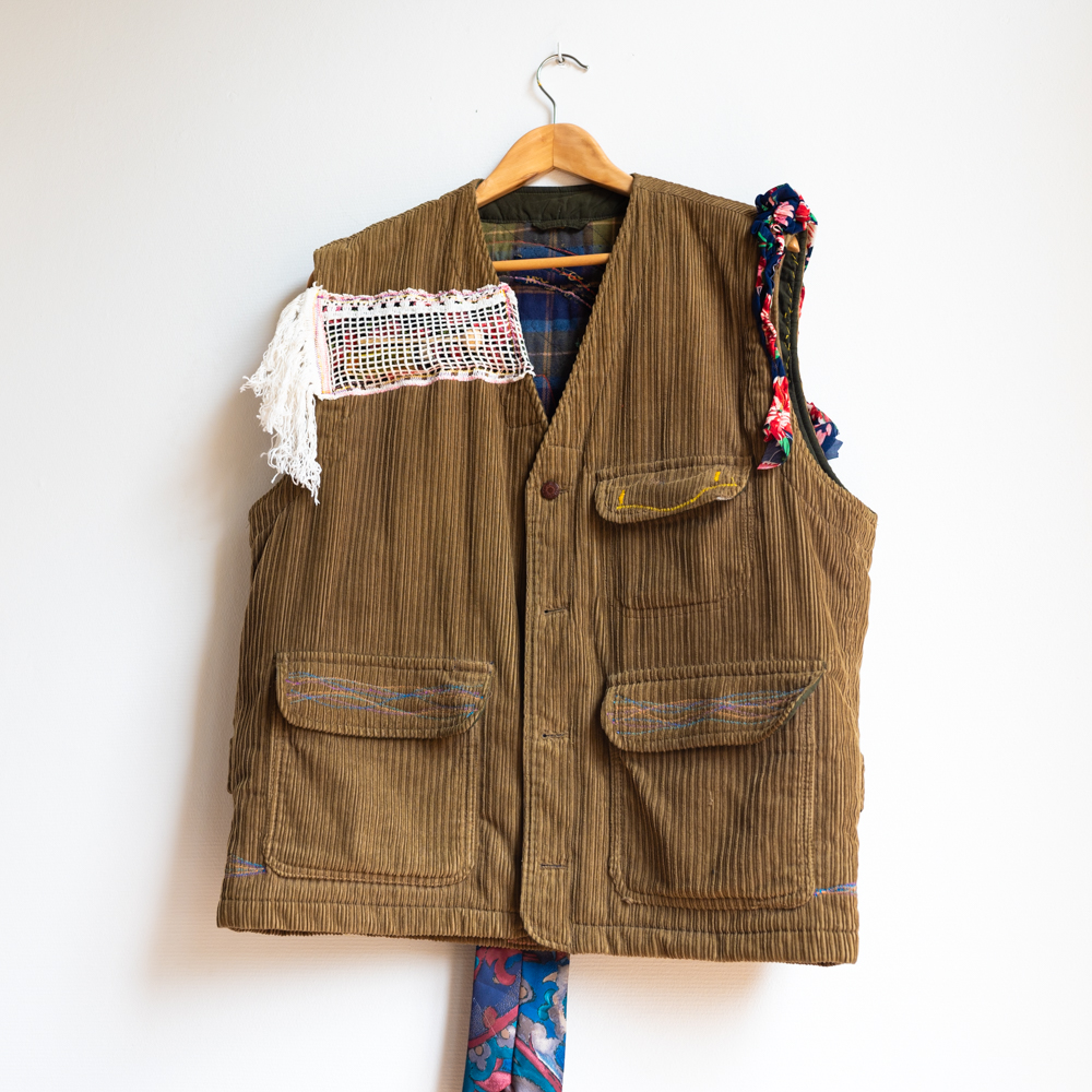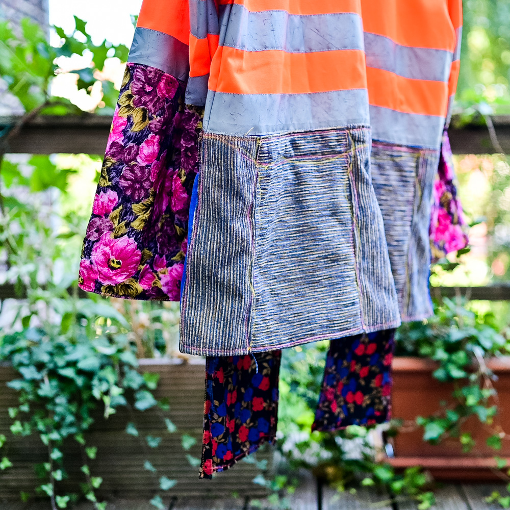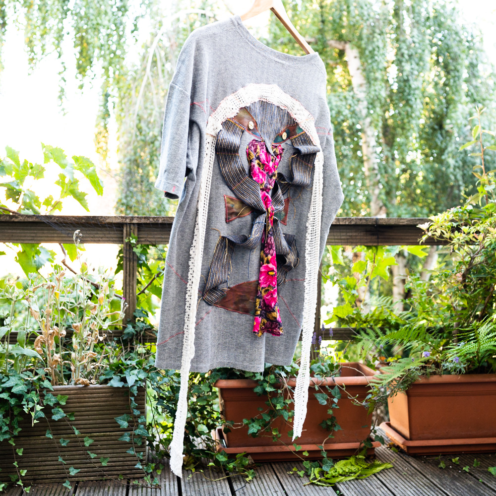 J’utilise des tissus chinés de toutes sortes, ci et là, j’assemble à la machine les textures, les fils, les reliefs et leurs histoires.