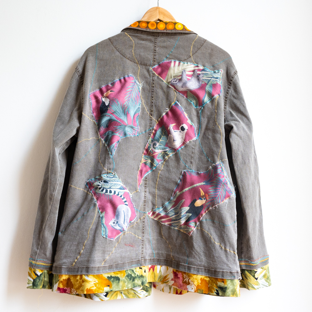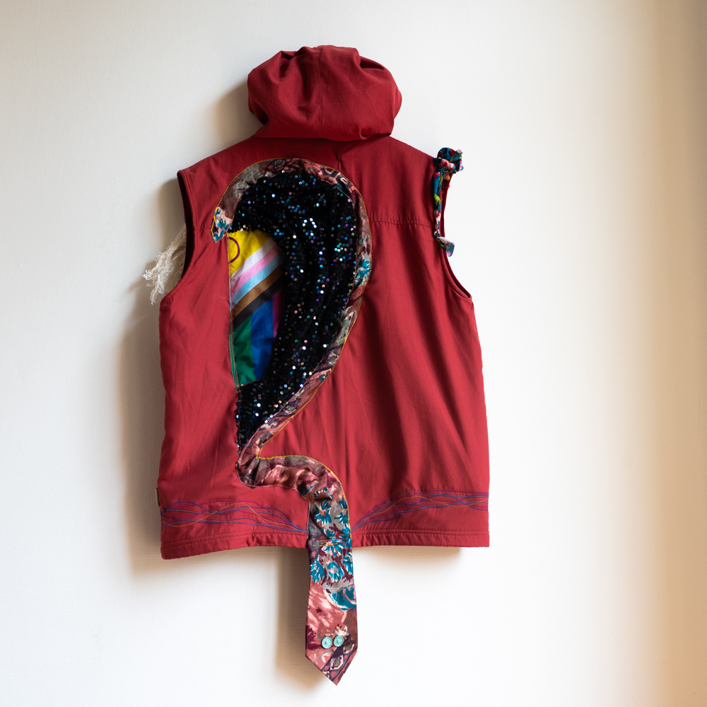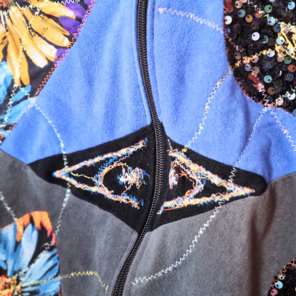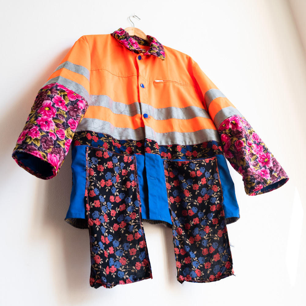J’utilise des tissus chinés de toutes sortes, ci et là, j’assemble à la machine les textures, les fils, les reliefs et leurs histoires.